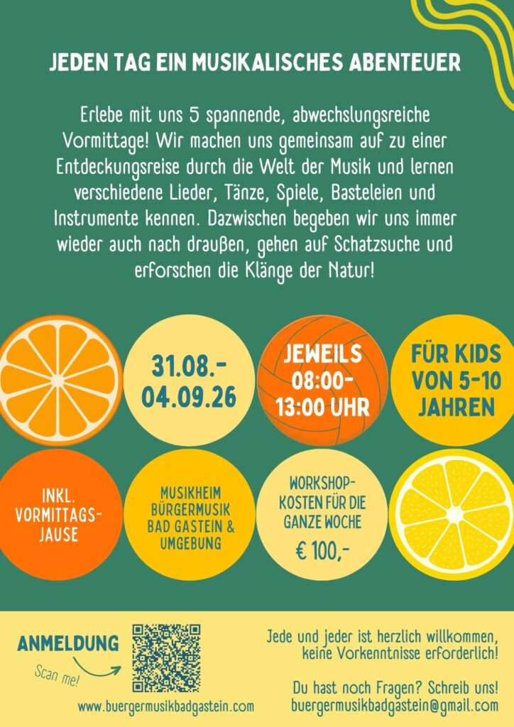 Von 25. bis 29. August 2025 könnt ihr wieder eine ganze Woche voll von musikalischen Abenteuern mit uns erleben! Fünf spannende, abwechslungsreiche Vormittage voll von Liedern, Tänzen, Spielen, Basteleien und Instrumenten.